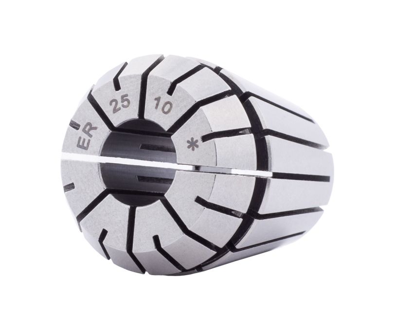 Цанга прецизионная ER25AA-10 (DIN 6499B, ISO 15488-B) предназначена для фиксации осевого инструмента с диаметром хвостовика 9,1 ... 10 мм, применяется совместно с патронами типа ER. Сквозное отверстие позволяет размещать инструмент, длина которого превышает высоту цанги. Зажимное усилие на хвостовик инструмента осуществляется в двух зонах, что обеспечивает надежное крепление инструмента и существенное снижает радиальное биение в процессе эксплуатации.